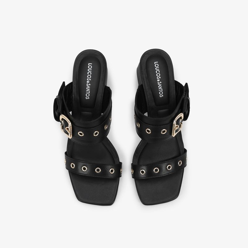 O tamanco possui tira superior com detalhe em ilhós, fivela em metal dourado e detalhe estruturado em nó.