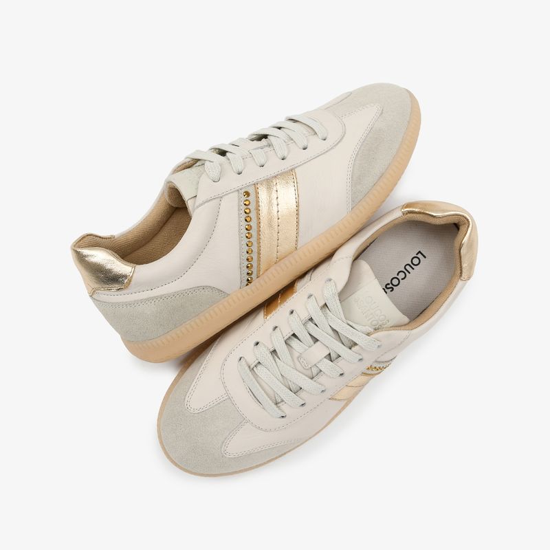 O modelo possui fechamento por atacador, detalhes em couro camurça, couro metalizado e brilho hotfix cristal dourado.